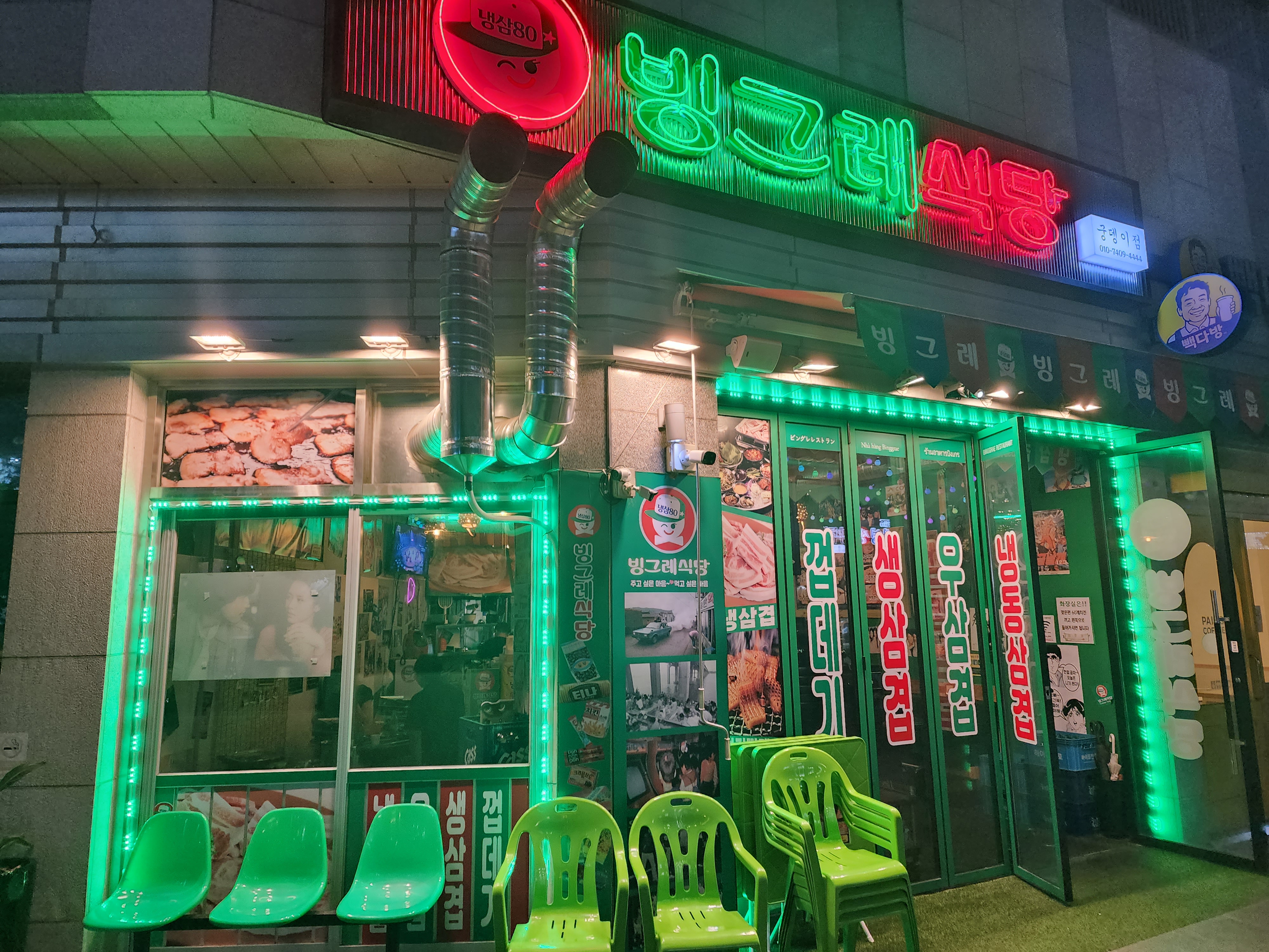 빙그레식당 외관부터 약간 촌스러운듯한 조명과 옛날느낌 물씬 나는 LED간판으로 레트로한 감성을 잘 살려놨더라고요. 안에서 들려오는 1980~90년대 노래들 때문인지 더 시선이 가더라고요.
