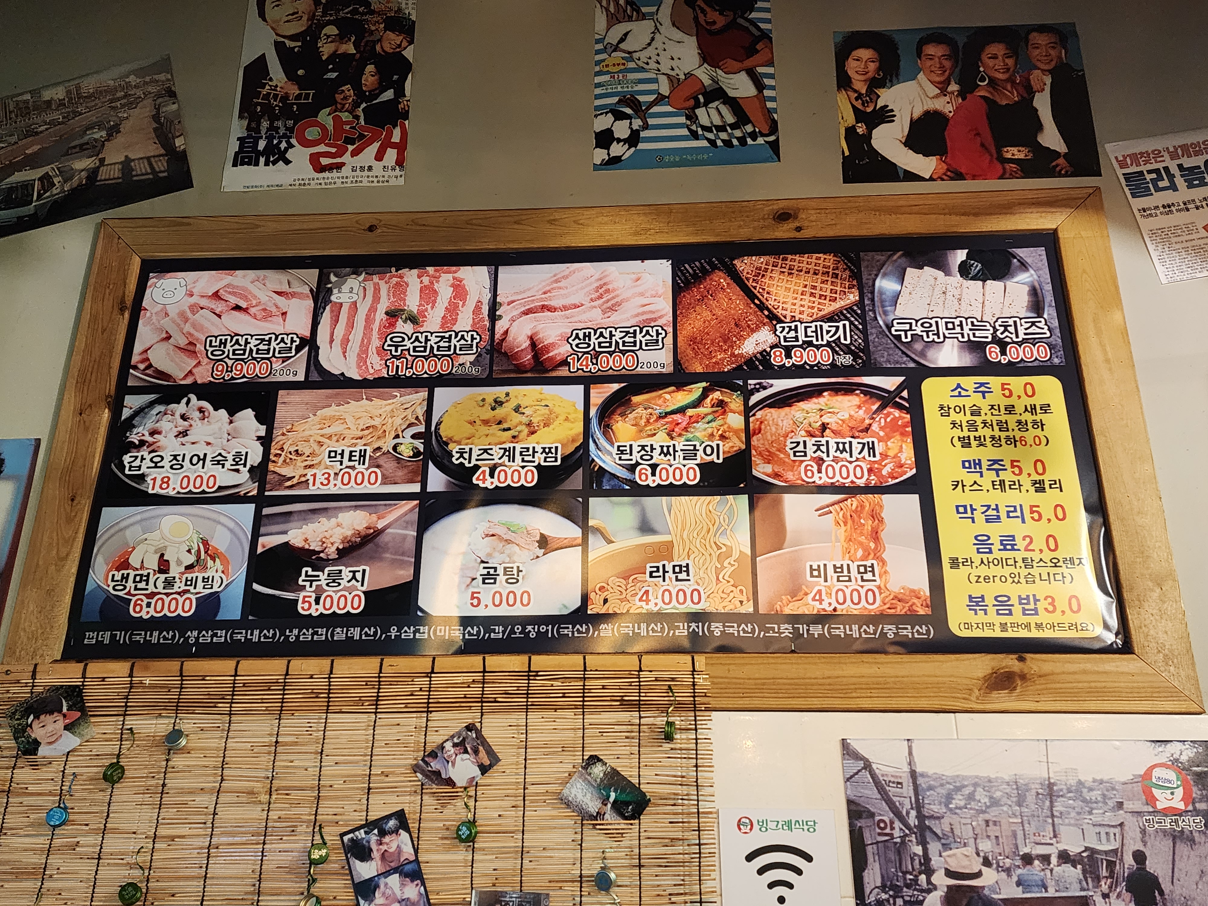 내부에 들어오면 벽에 옛날가수 포스팅이나 고전오락게임 옛날만화 등을 붙여놓고 오래된 티비나 소품으로 레트로 감성을 좀 더 살렸더라고요. 완전 제스타일 ㅎㅎ