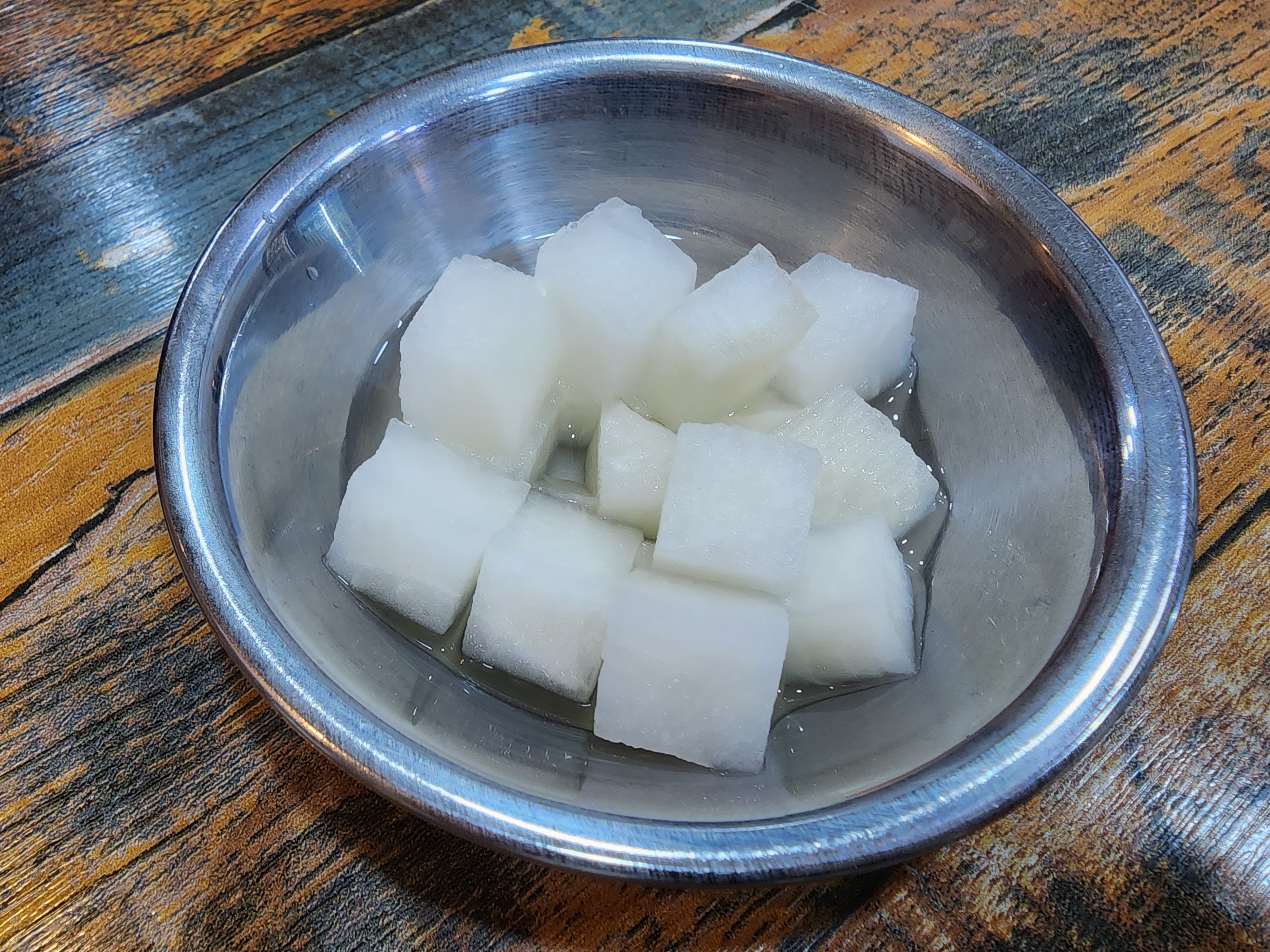 기본 세팅으로는 양념소스와 갈릭소스, 치킨무가 나오더라고요.