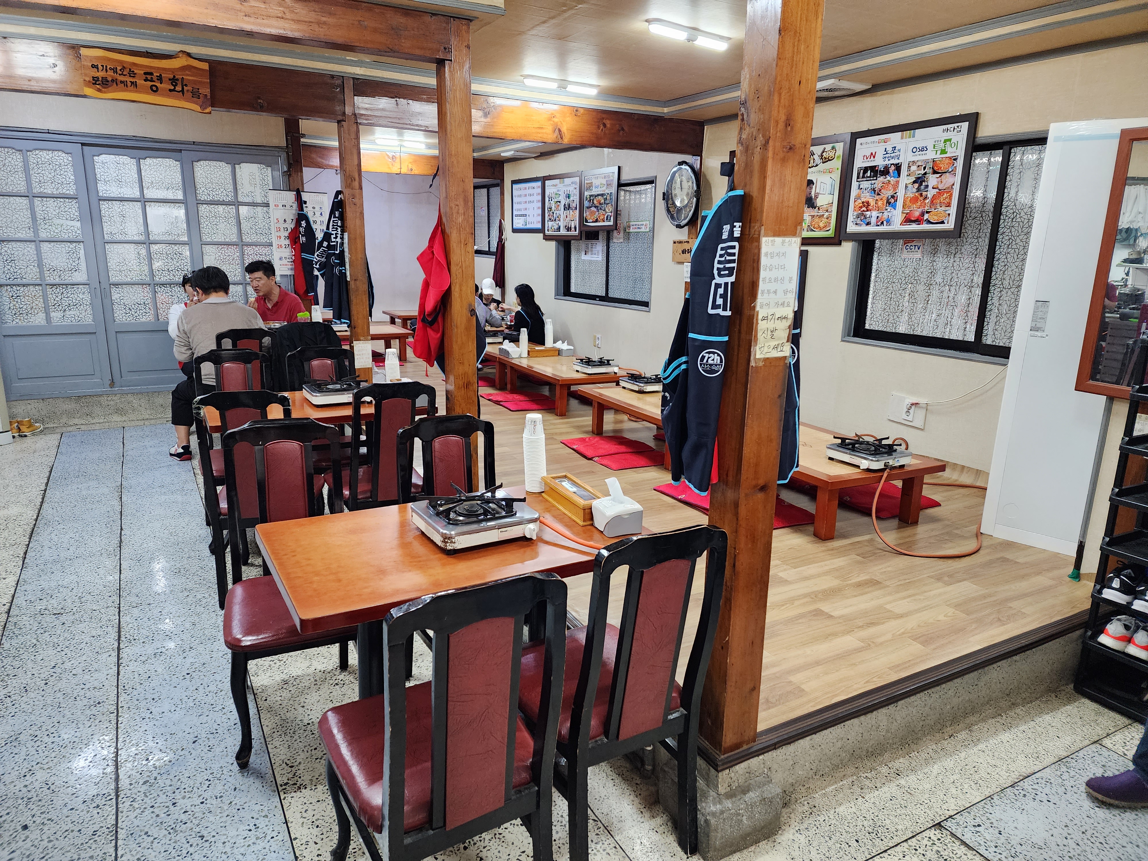 외관에서부터 오랫동안 전통을 이어온 맛집 분위기 었는데 내부에 들어오니 옛날 시골에 있는 식당처럼 일반 테이블 의자와 마룻바닥으로 된 자리로 되어있었고 4인석 10 테이블 정도 있었어요.