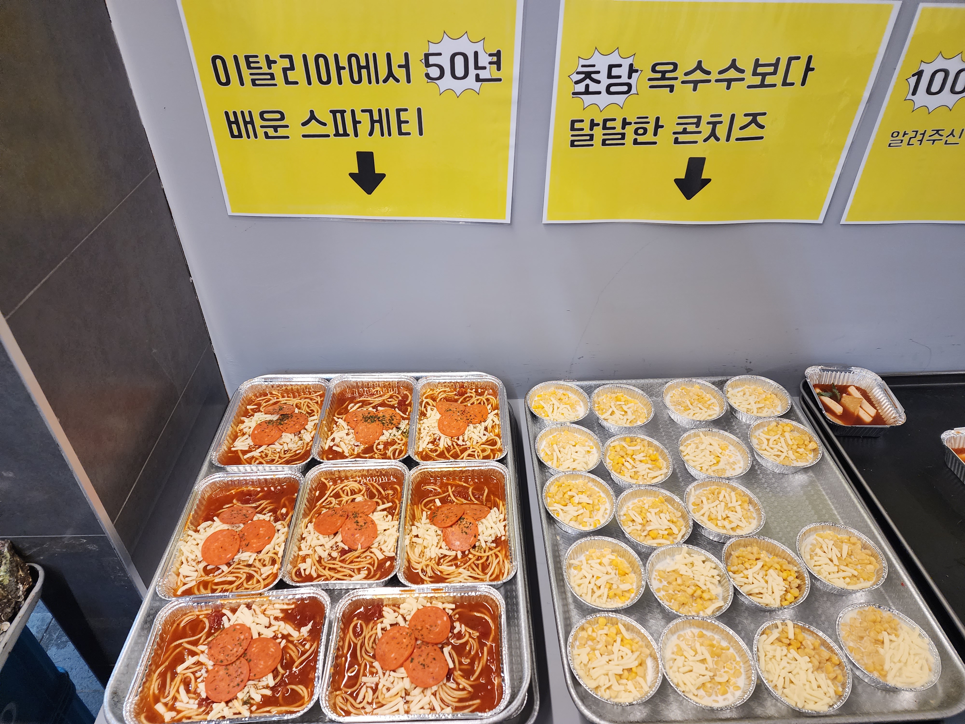 불위에 바로 올려 먹을 수 있는 파스타, 떡볶이, 콘치즈, 조개탕도 준비되어 있었어요!