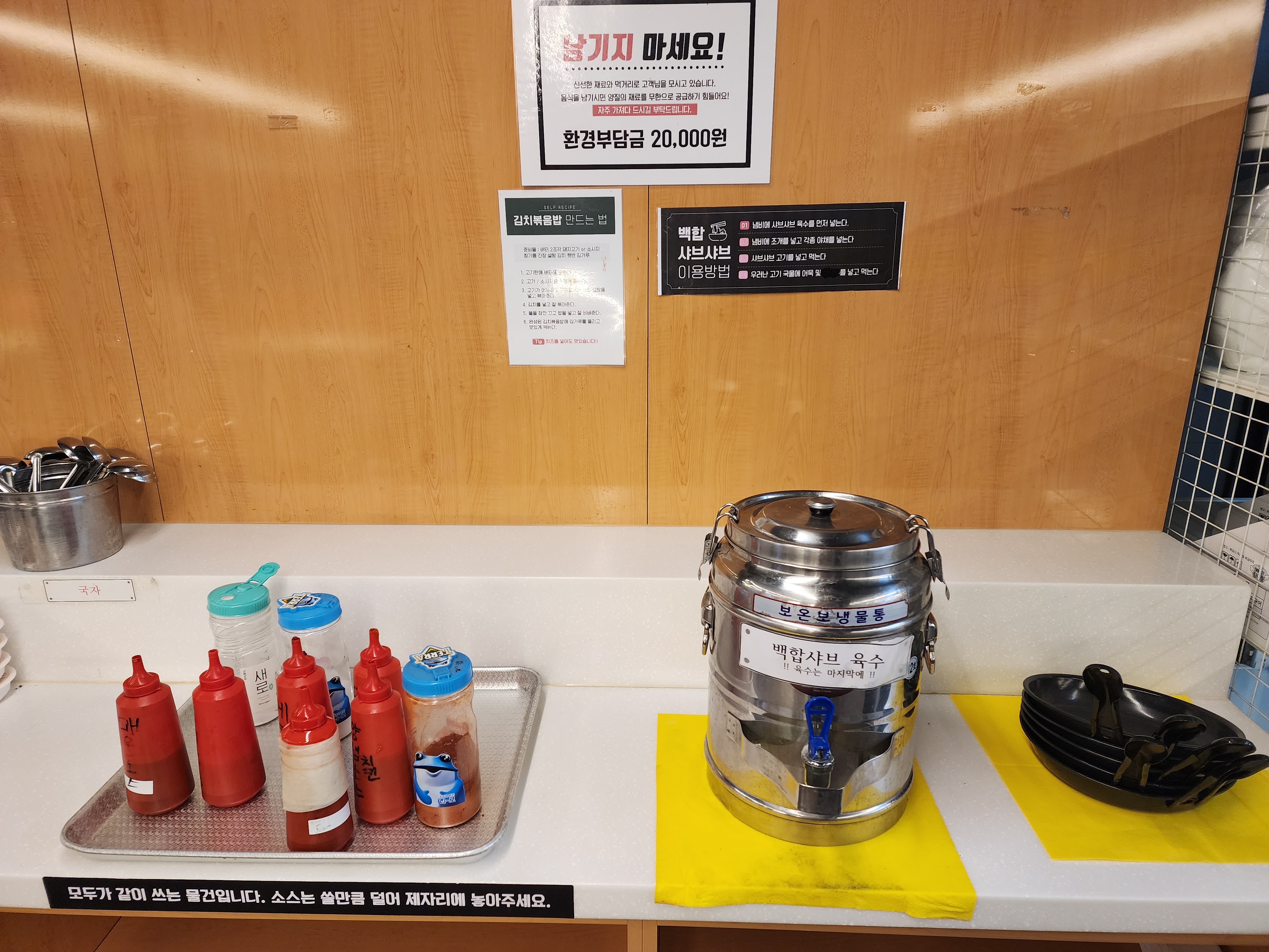 라면과 햇반도 있었는데 이 두 가지는 구매해야 하는 상품이었어요. 구매 방법은 일단 가지고 가서 드시고 위 사진처럼 각자 자리마다 있는 초록 바구니에 다 먹은 라면 봉지랑 햇반 또는 소주병, 맥주병을 담아 나갈 때 결제 하는 방식이었어요.