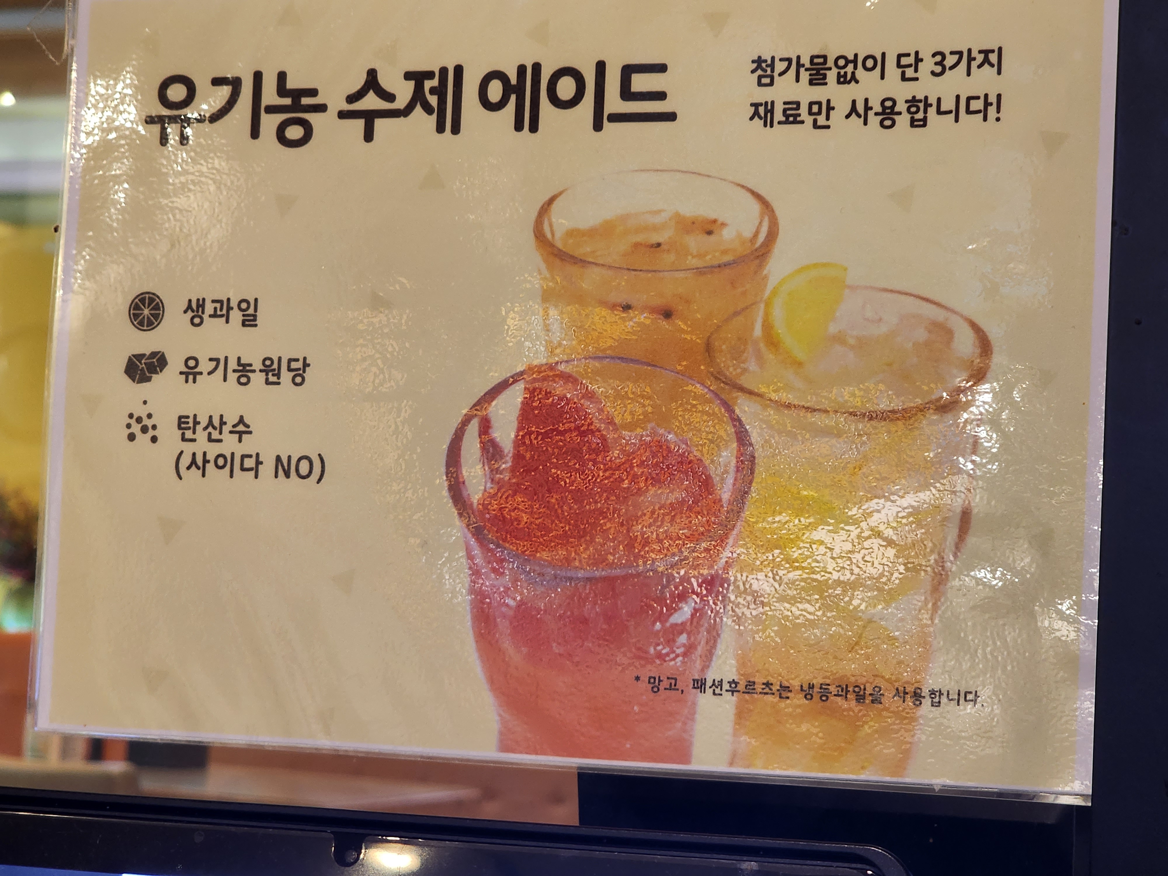 첨가물 없이 단 생과일, 유기농원당, 탄산수 3가지만 이용했다는 유기농 수제에이드도 있었어요.