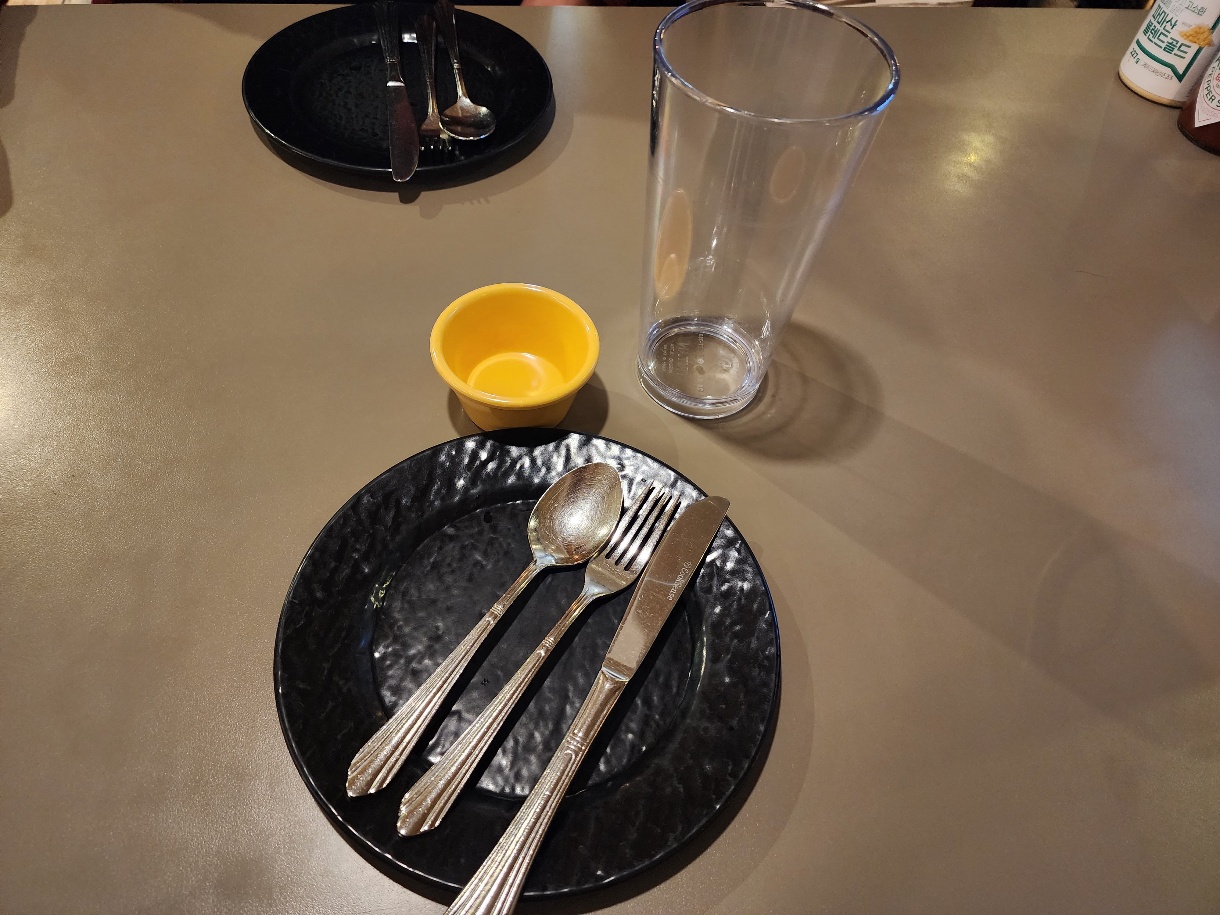 주문 시 앞접시 포크 나이프 수저 세팅해 주시고 피클종지, 음료 컵 나오면