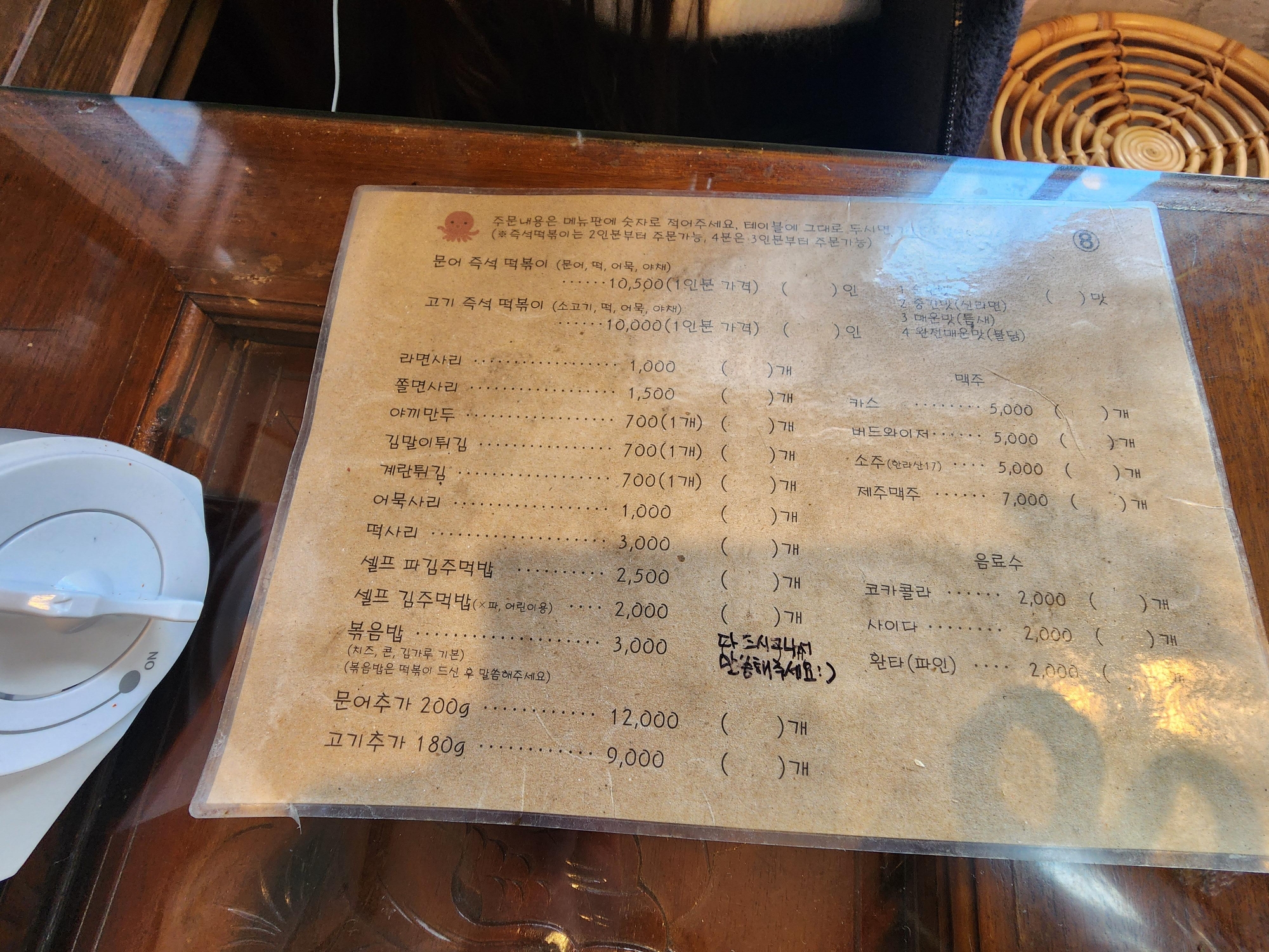 가격은 1인분 기준 문어 10.5 , 고기 10.0 이였어요.