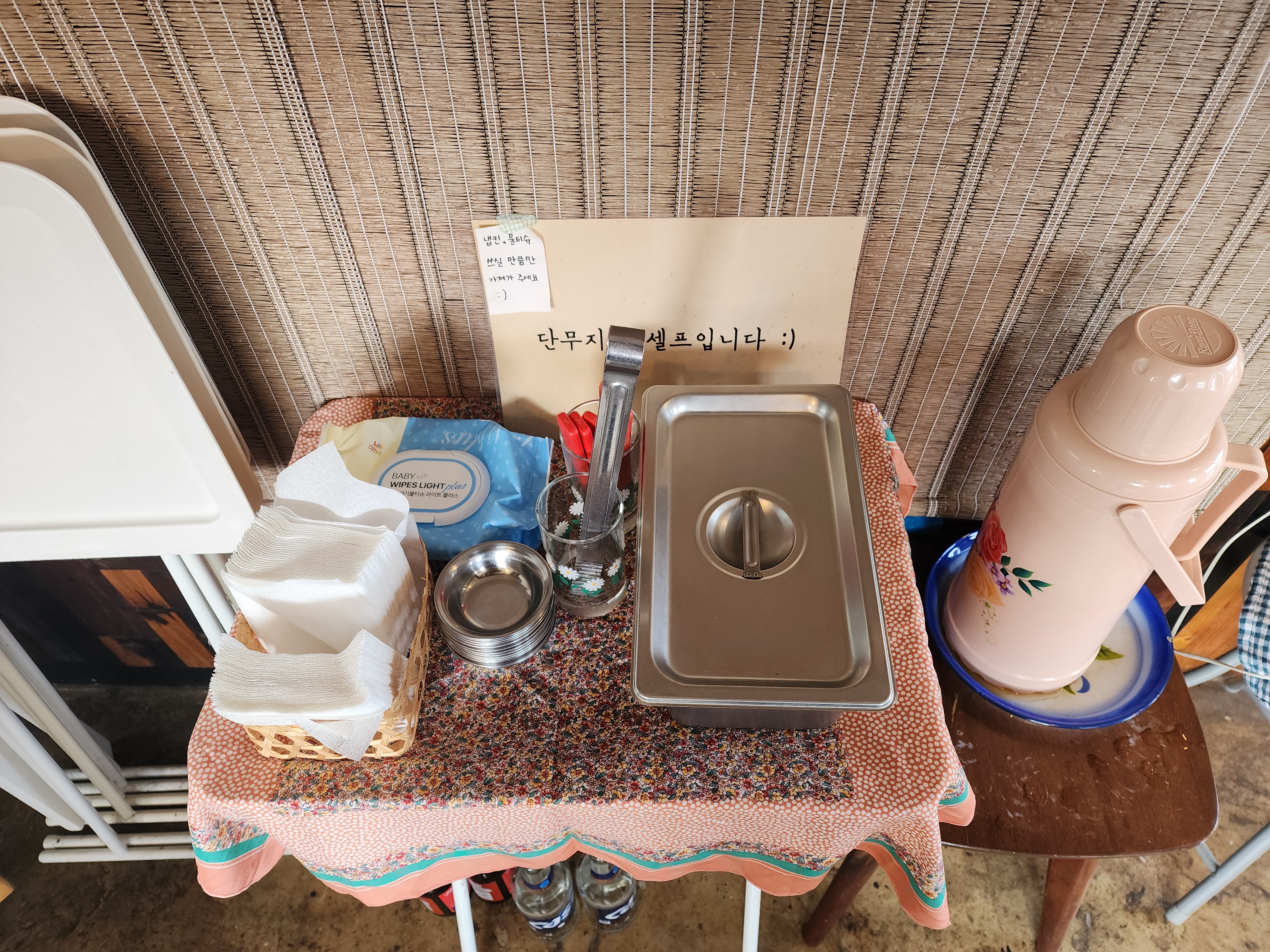 한편에는 냅킨, 물티슈, 단무지, 따듯한 차 준비되어 있어 원하는 만큼 가지고 가시면 되더라고요.